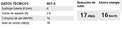 SILVENT 007-X: es una pistola de soplado de uso seguro, diseñada con una tecnología de boquilla de aire revolucionaria para una eficiencia, seguridad y reducción de ruido óptimas. La nueva tecnología patentada multi Laval constituye una nueva dimensión en la tecnología de soplado. El efecto se logra optimizando el cambio de presión del aire de energía potencial a energía cinética concentrada deseada. La boquilla de aire de acero inoxidable es el resultado de la I + D líder de Silvent en dinámica de aire comprimido. La pistola de soplado es adecuada en cualquier industria donde se requieran herramientas profesionales para hacer un trabajo rápido, silencioso y teniendo en cuenta la seguridad del operario.
